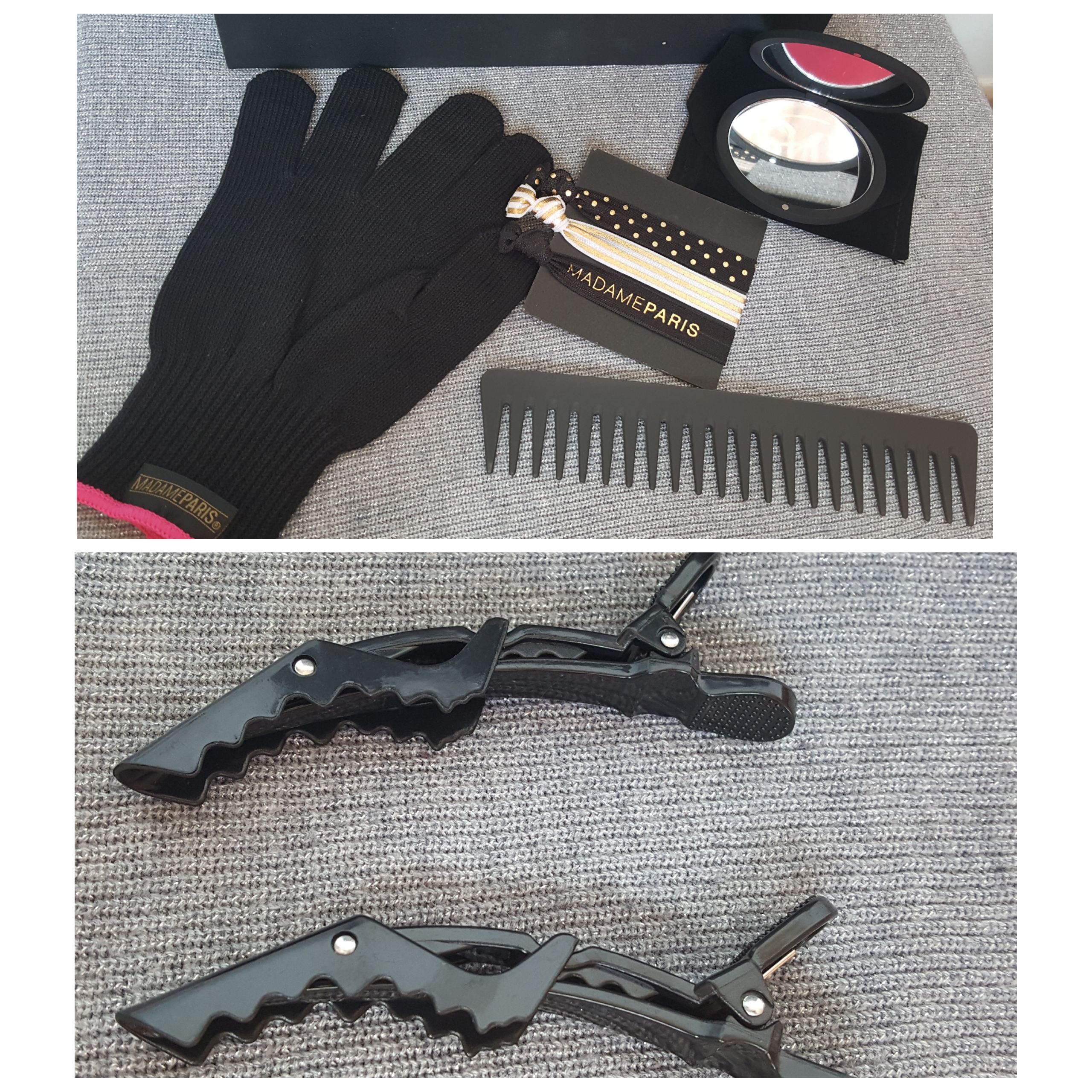 Un gant indispensable à l’utilisation de l’appareil, 2 pinces pour cheveux, des élastiques tout mignons, un miroir de poche et un peigne.
