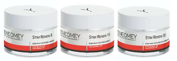 Comme chaque âge de la vie nécessite un soin adapté, le Laboratoire ENEOMEY a développé une gamme complète composée de 3 soins de nuit à base d’acide glycolique dosés respectivement à 8, 15 et 30% pour répondre aux besoins de toutes les femmes.