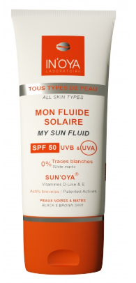 Le Fluide solaire SUN’OYA 50+ : issu de la technologie brevetée « SUN’OYA® », idéal pour les peaux pigmentées vulnérables au soleil et/ou sous traitement anti-taches ou anti-imperfections, il filtre les UVB & UVA et garantit une haute protection solaire sans traces blanches. Made in France. Son prix : 15.90€.